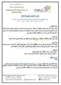 ▪︎ حالة الطقس : صحو بوجه عام على معظم محافظات السلطنة مع إحتمال تصاعد الأتربة والغبار بفعل الرياح النشطة على المناطق الصحراوية وإحتمال تشكل السحب المنخفضة أو الضباب المتقطع خلال فترة آخر الليل والصباح الباكر على أجزاء من محافظتي الظاهرة والبريمي .