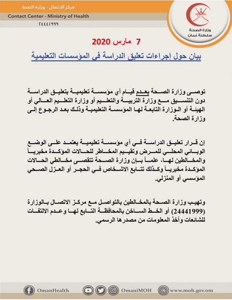 توصي وزارة الصحة بعدم قيام أي مؤسسة تعليمية بتعليق الدراسة دون التنسيق مع وزارة التربية والتعليم أو وزارة التعليم العالي أو الهيئة أو الوزارة التابعة لها المؤسسة التعليمية وذلك بعد الرجوع إلى وزارة الصحة .