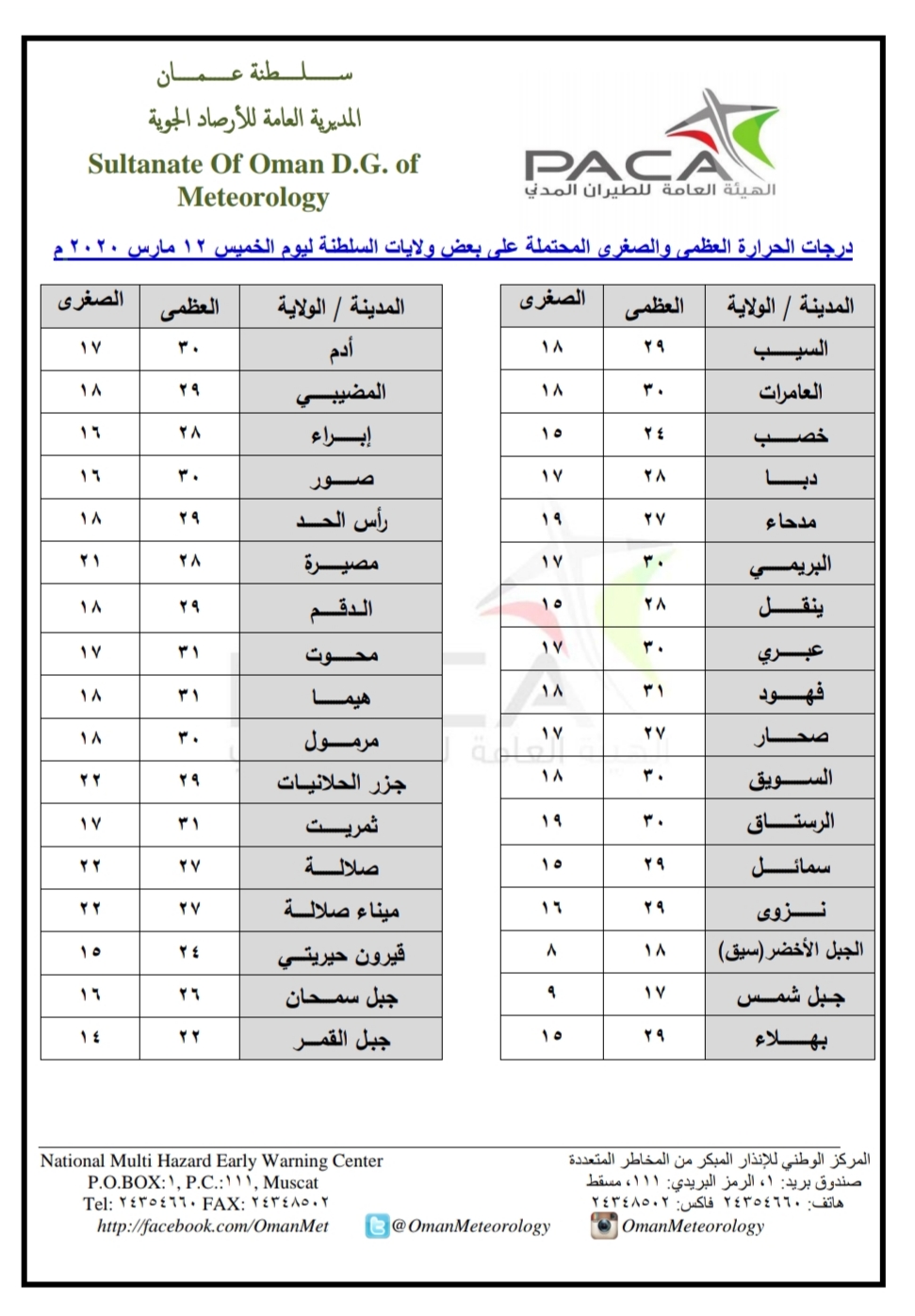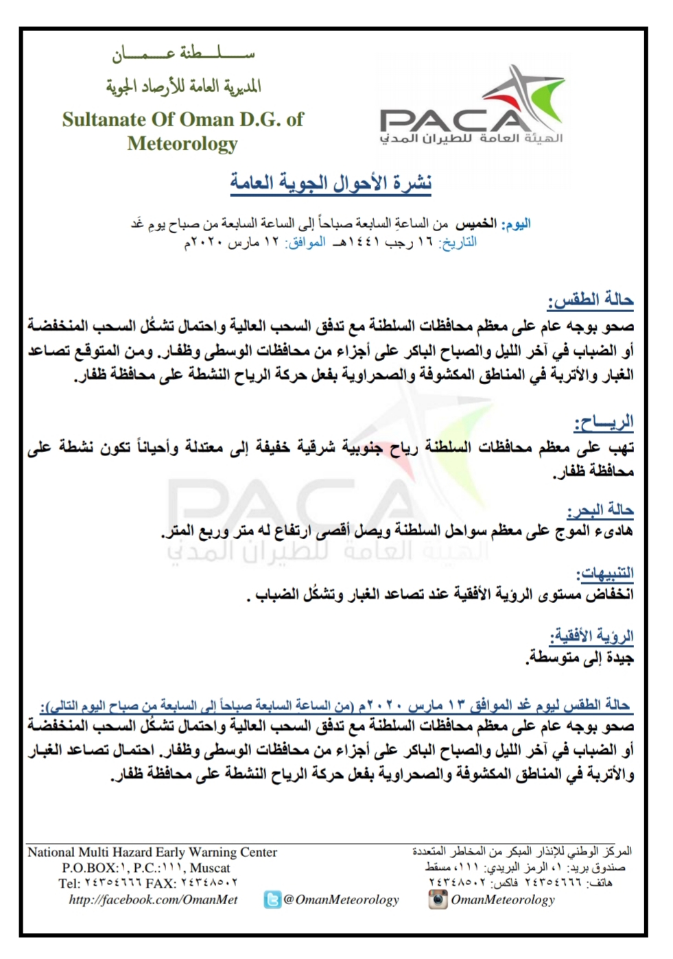 متابعينا الكرام إليكم فيما يلي نشرة الأحوال الجوية في محافظات السلطنة لهذا اليوم : الخميس السابع عشر من رجب 1441هـ الموافق الثاني عشر من مارس 2020 – بإذن الله تعالى .