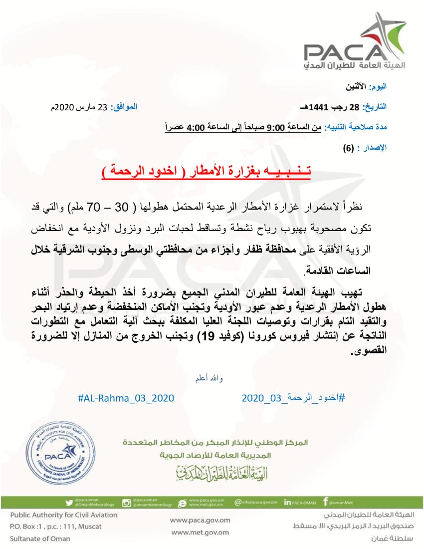 نظراً لاستمرار غزارة الأمطار الرعدية المحتمل هطولها والتي قد تبلغ من ( 30 – 70 ملم ) حيث قد تكون مصحوبة بهبوب رياح نشطة وتساقط لحبات البرد ونزول الأودية مع انخفاض الرؤية الأفقية على محافظة ظفار وأجزاء من محافظتي الوسطى وجنوب الشرقية خلال الساعات القادمة .