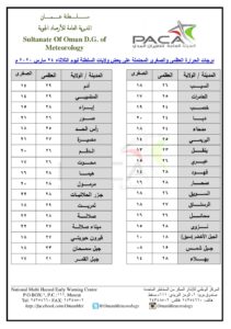 متابعينا الكرام إليكم فيما يلي نشرة الأحوال الجوية في محافظات السلطنة لهذا اليوم : الثلاثاء التاسع والعشرين من رجب 1441هـ الموافق الرابع والعشرين من مارس 2020 – بإذن الله تعالى .