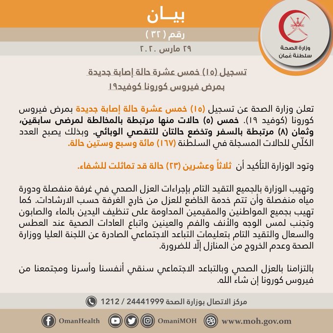 وبهذا يصبح العدد الكلي للحالات المسجلة في السلطنة (١٦٧) حالة .