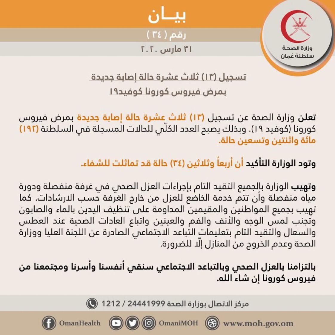 أعلنت وزارة الصحة عن تسجيل (١٣) ثلاث عشرة حالة إصابة جديدة بمرض فيروس كورونا كوفيد١٩ وبذلك يصبح العدد الكلّي للحالات المسجلة في السلطنة (١٩٢) مائة واثنتين وتسعين حالة. وتود الوزارة التأكيد أن أربعاً وثلاثين (٣٤) حالة قد تماثلت للشفاء.