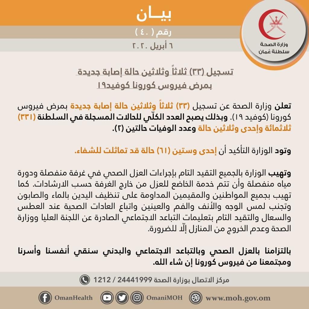 أعلنت وزارة الصحة عن تسجيل (33) إحدى وثلاثين حالة إصابة جديدة بمرض فيروس كورونا (کوفید 19) وبذلك يصبح العدد الكلي للحالات المسجلة في السلطنة (331) ثلاثمائة وإحدى وثلاثين حالة .