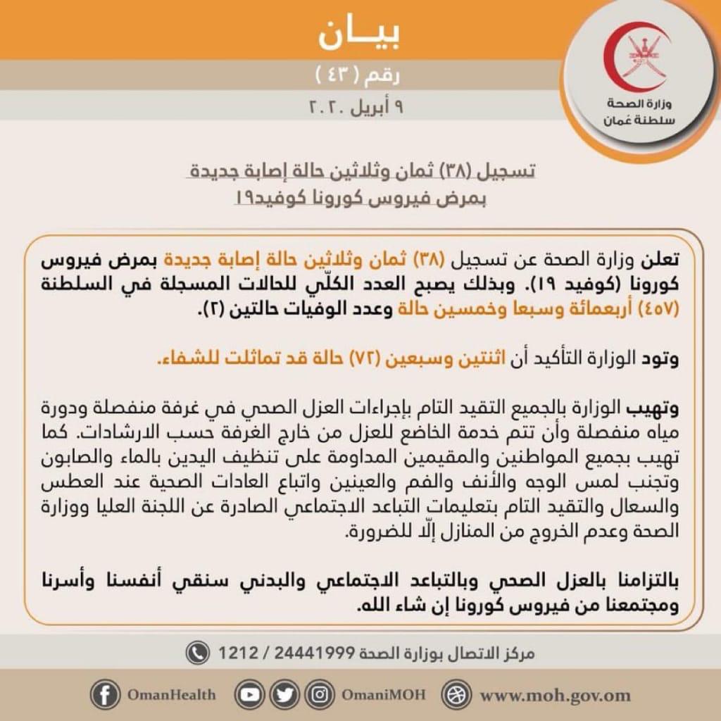 أعلنت وزارة الصحة عن تسجيل (۳۸) ثمان وثلاثين حالة إصابة جديدة بمرض فيروس كورونا (كوفيد 19). وبذلك يصبح العدد الكلي للحالات المسجلة في السلطنة(457) أربعمائة وسبعا وخمسين حالة وعدد الوفيات حالتين (2).