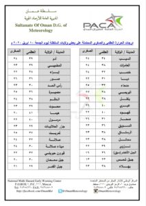 متابعينا الكرام إليكم فيما يلي نشرة الأحوال الجوية في محافظات السلطنة لهذا اليوم : الجمعه السادس عشر من شعبان 1441هـ الموافق العاشر من أبريل 2020م – بإذن الله تعالى .