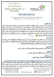 ▪︎ حالة الطقس : صحو بوجه عام على معظم محافظات السلطنة مع تدفق السحب العالية والمتوسطة واحتمال تكون السحب الركامية وهطول أمطار متفرقة تكون رعدية أحياناً على جبال الحجر خلال المساء ومن المحتمل تصاعد الأتربة والغبار بفعل حركة الرياح النشطة على المناطق الصحراوية والمكشوفة ، واحتمال تشكل السحب المنخفضة أو الضباب في فترة آخر الليل والصباح الباكر على أجزاء من المناطق الساحلية لبحر عمان ومحافظات شمال الشرقية وجنوب الشرقية والوسطى وظفار .