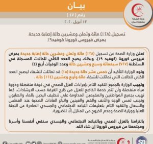 أعلنت وزارة الصحة عن تسجيل (128) مئة وثمان وعشرون حالة إصابة جديدة بمرض فيروس كورونا (کوفید ۱۹). وبذلك يصبح العدد الكلي للحالات المسجلة في السلطنة