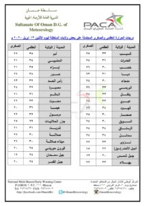 ▪︎ درجات الحرارة : من المتوقع أن تبلغ درجة الحرارة اليوم في مسقط بإذن الله – 31 العظمى ، والصغرى 26 – فيما تبلغ في صلالة : العظمى 29 والصغرى 27 ، وتصل درجة الحرارة العظمى اليوم 38 في ولاية صور في حين تصل أدنى درجات الحرارة (12) في جبل شمس .