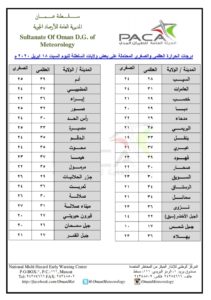 متابعينا الكرام إليكم فيما يلي نشرة الأحوال الجوية في محافظات السلطنة لهذا اليوم : السبت الرابع والعشرين من شعبان 1441هـ الموافق الثامن عشر من أبريل 2020م – بإذن الله تعالى .