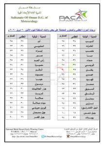 متابعينا الكرام إليكم فيما يلي نشرة الأحوال الجوية في محافظات السلطنة لهذا اليوم : الإثنين السادس والعشرين من شعبان 1441هـ الموافق العشرين من أبريل 2020م – بإذن الله تعالى .