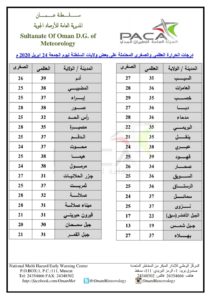 متابعينا الكرام إليكم فيما يلي نشرة الأحوال الجوية في محافظات السلطنة لهذا اليوم : الجمعة الثلاثين من شعبان 1441هـ الموافق الرابع والعشرين من أبريل 2020م – بإذن الله تعالى .