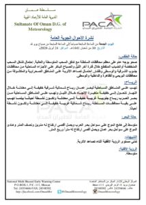 ▪︎ الرياح : تهب على المناطق الساحلية لبحر عمان رياح شمالية شرقية خفيفة إلى معتدلة خلال النهار تتحول إلى خفيفة متغيرة الإتجاه خلال الليل وتهب على المناطق الساحلية من بحر العرب رياح جنوبية غربية خفيفة إلى معتدلة وتكون نشطة أحيانا بينما تهب على بقية محافظات السلطنة رياح شمالية غربية خفيفة إلى معتدلة وتكون نشطة أحيانا .