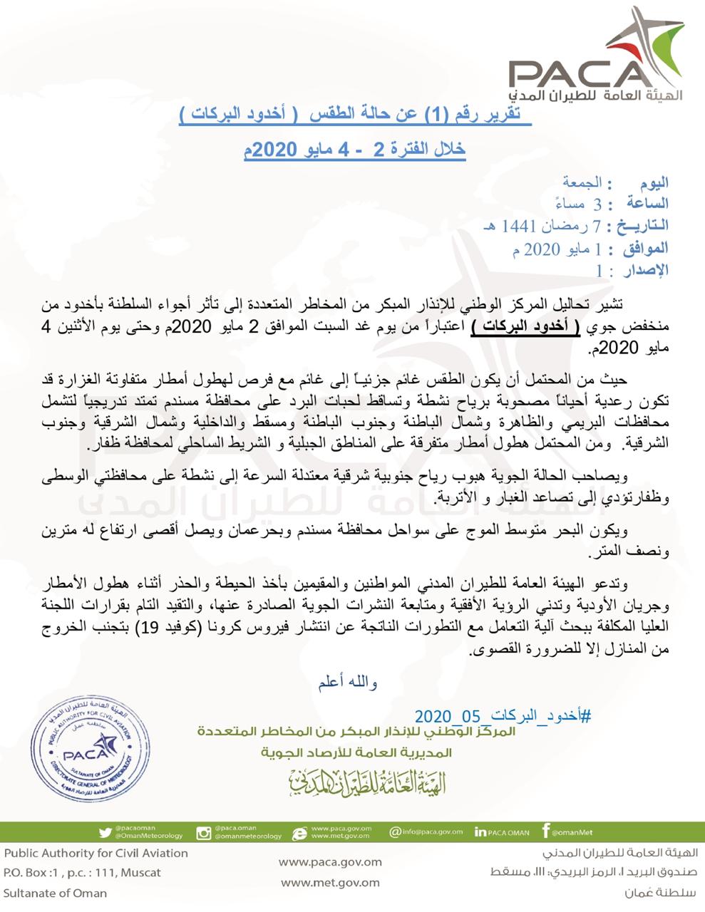 تشير تحاليل المركز الوطني للإنذار المبكر من المخاطر المتعددة إلى تأثر أجواء السلطنة بأخدود من منخفض جوي ( أخدود البركات ) اعتبارا من يوم غد السبت الموافق 2 مايو 2020م وحتى يوم الأثنين 4 مايو 2020م.