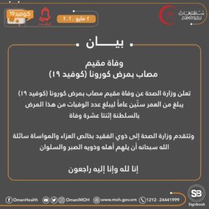 أعلنت وزارة الصحة عن وفاة مقيم مصاب بمرض كورونا كوفيد١٩ يبلغ من العمر ستّين عاماً ليبلغ عدد الوفيات من هذا المرض بالسلطنة إثنتا عشرة وفاة. وتتقدم وزارة الصحة إلى ذوي الفقيد بخالص العزاء والمواساة سائلة الله سبحانه أن يلهم أهله وذويه الصبر والسلوان.