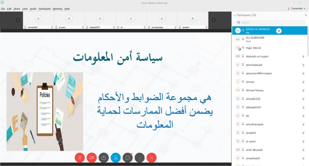 نفذت دائرة أمن المعلومات الإلكترونية بوزارة التربية والتعليم إجتماعها الإفتراضي مع مديريات الوزارة حول تحديث وثيقة السياسات الأمنية ويأتي الاجتماع في ضوء الإجراءات التي تقوم بها دائرة أمن المعلومات الإلكترونية، المتضمنة البدء في تحديث الأصدار الأول من وثيقة السياسات الأمنية للوزارة، كذلك حرصاً من الدائرة على مشاركة جميع التقسيمات الإدارية بالوزارة في إبداء الملاحظات والمرئيات التطويرية للإصدار الثاني من السياسات الأمنية للوزارة.وفي ظل الإجراءات الاحترازية الحالية والتوصيات الصادرة في تفعيل العمل عن بُعد، فقد عقدت الدائرة لقاء إفتراضي يستهدف مدراء ورؤساء أقسام مديريات ديوان عام الوزارة.حيث افتتح اللقاء طلال العاصمي مدير دائرة أمن المعلومات الإلكترونية، أشار ف إلى إيجاز مختصر لأهمية اللقاء والنتائج المتوقعة بعد الانتهاء من اللقاء.