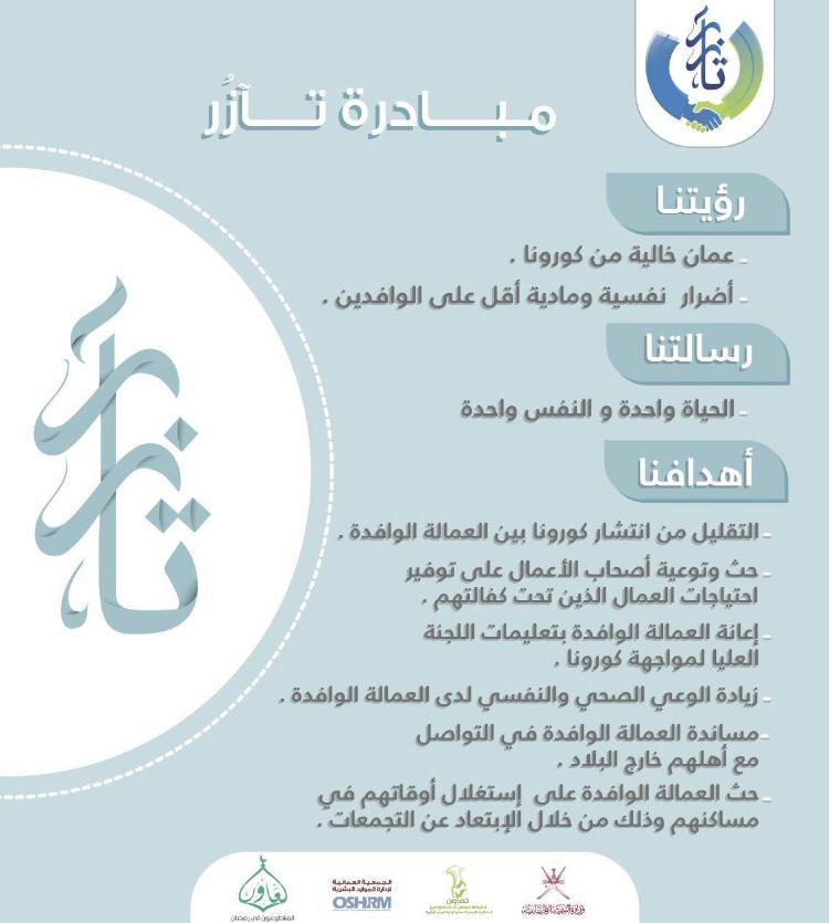 من هُنـا بدأت تآزُر : إحدى المبادرات التطوعيـة والتي استهدفـت العمـالة الوافدة .تم تنظيم هذه المبادرة من قِبل الشبكة العمانية للمتطوعين “تعاون”بإشراف من الأستاذ محمد الصوافي .