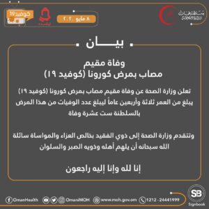 أعلنت وزارة الصحة عن وفاة مقيم مصاب بمرض كورونا كوفيد١٩ يبلغ من العمر ثلاثة وأربعين عاماً ليبلغ عدد الوفيات من هذا المرض بالسلطنة ست عشرة وفاة.