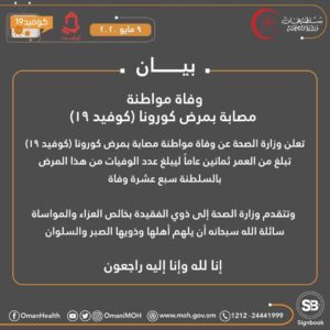 أعلنت وزارة الصحة عن وفاة مواطنة مصابة بمرض كورونا كوفيد١٩ وتبلغ من العمر ثمانين عاماً ليبلغ عدد الوفيات من هذا المرض بالسلطنة سبع عشرة وفاة. وتتقدم وزارة الصحة إلى ذوي الفقيدة بخالص العزاء والمواساة سائلة الله سبحانه أن يلهم أهله وذويه الصبر والسلوان