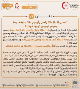 اعلنت وزارةالصحة عن تسجيل (148) مائة وثمان وأربعين حالة إصابة جديدة بمرض فيروس كورونا كوفيد١٩، منها ثلاث وثلاثون (33) حالة لعمانيين، ومائة وخمس عشرة (115) حالة لغير عمانيين وبذلك يصبح العدد الكلّي للحالات المسجلة في السلطنة (3721) ثلاثة آلاف وسبعمائة وإحدى وعشرين حالة.