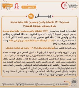 أعلنت وزارة الصحة عن تسجيل 322 ثلاثمائة واثنين وعشرين حالة إصابة جديدة بمرض فيروس كورونا كوفيد 19 منها 80 ثمانون حالة لعمانيين، و 242 ومائتان واثنتان وأربعون حالة لغير العمانيين، وبذلك يصبح العدد الكلي للحالات المسجلة في السلطنة ( 4341 ) أربعة آلاف وثلاثمائة وإحدى وأربعين حالة، وعدد الوفيات 17 سبع عشرة حالة.