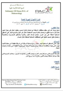 متابعينا الكرام إليكم فيما يلي نشرة الأحوال الجوية في محافظات السلطنة لهذا اليوم : الجمعة الحادي والعشرين من رمضان المبارك 1441هـ الموافق الخامس عشر من مايو 2020م – بإذن الله تعالى .