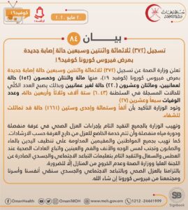 أعلنت وزارة الصحة عن تسجيل (٣٧٢) ثلاثمائة واثنتين وسبعين حالة إصابة جديدة بمرض فيروس كورونا (کوفید ۱۹)، منها مائة واثنتان وخمسون (١٥٢) حالة لعمانيين، ومائتان وعشرون (٢٢٠) حالة لغير عمانيين وبذلك يصبح العدد الكلي للحالات المسجلة في السلطنة (٦٠٤٣) ستة آلاف وثلاثة وأربعين حالة، وعدد الوفيات سبعا وعشرين (٢٧)، وتود الوزارة التأكيد بأن ألف وستمائة وإحدى وستين (١٦٦١) حالة قد تماثلت للشفاء.