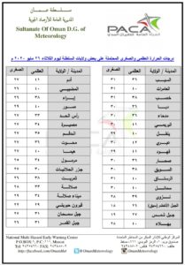 متابعينا الكرام إليكم فيما يلي نشرة الأحوال الجوية في محافظات السلطنة لهذا اليوم : الثلاثاء الثالث من شوال 1441هـ الموافق السادس والعشرين من مايو 2020م – بإذن الله تعالى .