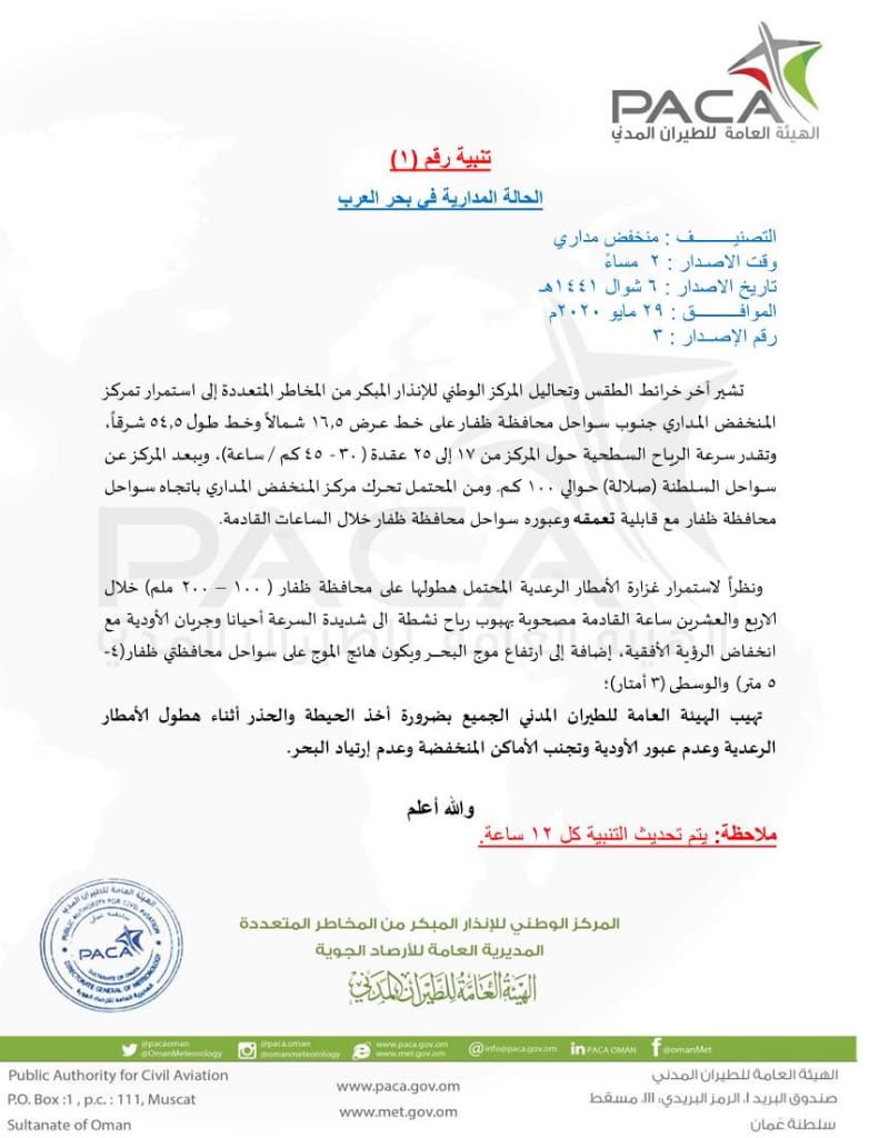 ومن المحتمل تحرك مركز المنخفض المداري باتجاه سواحل محافظة ظفار مع قابلية تعمقه وعبوره سواحل محافظة ظفار خلال الساعات القادمة.