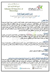 ▪︎ الرياح : تهب على سواحل بحر عمان رياح شمالية شرقية خفيفة إلى معتدلة نهاراً تتحول إلى متغيرة الاتجاه خفيفة ليلا ، فيما تهب على بقية محافظات السلطنة رياح جنوبية إلى جنوبية شرقية خفيفة إلى معتدلة وأحياناً نشطة على محافظتي الوسطى وظفار .