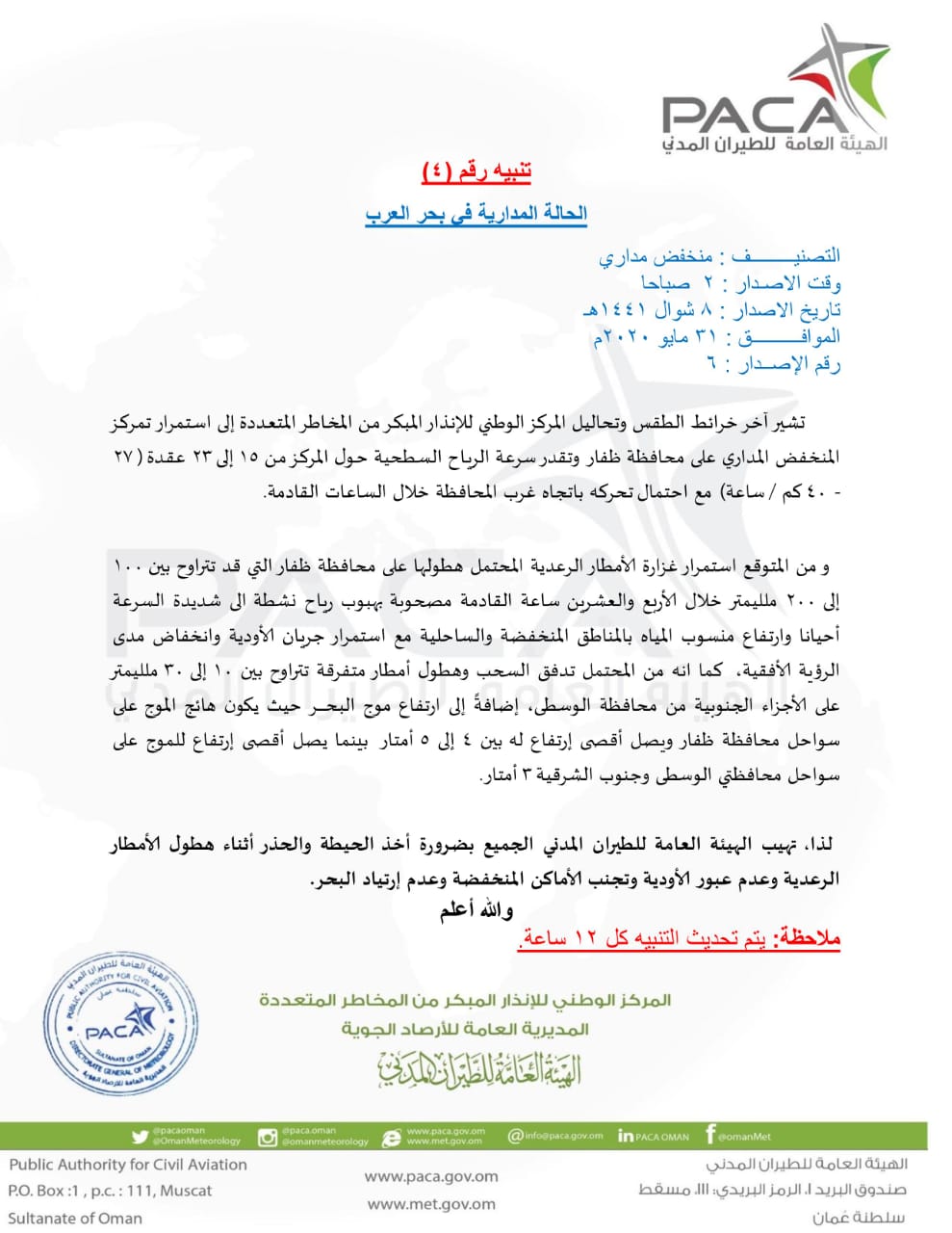 تشير آخر خرائط الطقس وتحاليل المركز الوطني للإنذار المبكر من المخاطر المتعددة إلى استمرار تمرکز المنخفض المداري على محافظة ظفار وتقدر سرعة الرياح السطحية حول المركز من ١٥ إلى ۲۳ عقدة ( ۲۷ – ٤٠ كم / ساعة) مع احتمال تحرکه باتجاه غرب المحافظة خلال الساعات القادمة.