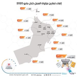وقالت إن عدد طلبات إلغاء تصاريح العمل الإلكترونية بلغت في محافظة مسقط (3545) طلب إلغاء منها (3502) طلب إلغاء تجاري و (43) طلب إلغاء خاصا ، وفي محافظة ظفار بلغت (361) طلب إلغاء ، منها (317) طلب إلغاء تجاريا و(44) طلب إلغاء خاصا، وبلغت طلبات إلغاء التصاريح في محافظة شمال الباطنة (226) طلب إلغاء ، منها (217) طلب إلغاء تجاريا و (9) طلبات إلغاء خاصة ، وبلغت طلبات الإلغاء في محافظة الداخلية (73) طلب إلغاء منها (65) طلب إلغاء تجاريا و(8) طلبات إلغاء خاصة، بينما بلغ عدد طلبات الإلغاء في محافظة جنوب الباطنة (63) طلب إلغاء منها (54) طلب إلغاء تجاريا و(9) طلبات إلغاء خاصة، وفي محافظة جنوب الشرقية (53) طلب إلغاء منها (46) طلب إلغاء تجاريا و (7) طلبات إلغاء خاصة.