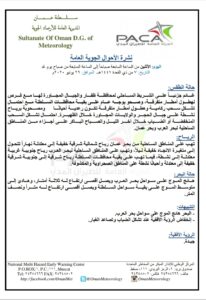 متابعينا الكرام إليكم فيما يلي نشرة الأحوال الجوية في محافظات السلطنة لهذا اليوم : الإثنين السابع من ذي القعدة 1441هـ الموافق التاسع والعشرين من يونيو 2020م – بإذن الله تعالى .