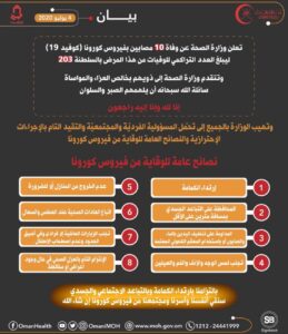 أعلنت وزارة الصحة عن وفاة 10 مصابين بفيروس كورونا كوفيد١٩ ليبلغ العدد التراكمي للوفيات من هذا المرض بالسلطنة 203.