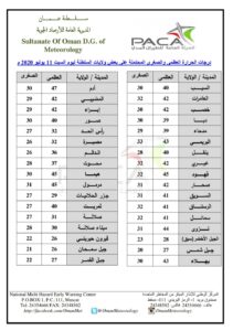 متابعينا الكرام إليكم فيما يلي نشرة الأحوال الجوية في محافظات السلطنة لهذا اليوم : الجمعة التاسع عشر من ذي القعدة 1441هـ الموافق الحادي عشر من يوليو 2020م – بإذن الله تعالى .