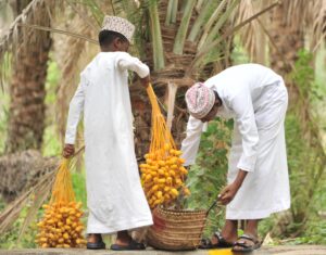 ويصاحب عملية الجداد عادات اجتماعية حافظ عليها العمانيون، تتمثل في التصدق بجزء من الثمار وإعطاء كميات منها لمن قدموا يد المساعدة من الأقارب والجيران والأصدقاء.