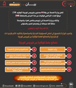 أعلنت وزارة الصحة عن وفاة 4 مصابين بفيروس كورونا كوفيد١٩ ليبلغ العدد التراكمي للوفيات من هذا المرض بالسلطنة 248.