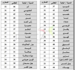 ▪︎ درجات الحرارة : من المتوقع أن تبلغ درجة الحرارة اليوم في مسقط بإذن الله 36 العظمى ، والصغرى 32 – فيما تبلغ في صلالة : العظمى 31 والصغرى 27 ، وتصل درجة الحرارة العظمى اليوم 46 في عدد من المواقع بالسلطنة ، في حين تصل أدنى درجات الحرارة (21) في جبل شمس .
