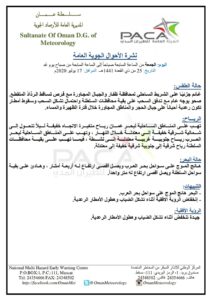 ▪︎ الرياح : تهب على المناطق الساحلية لبحر عمان رياح متغيرة الاتجاه خفيفة ليلا تتحول إلى شمالية شرقية خفيفة إلى معتدلة خلال النهار ، وتهب على المناطق الساحلية لبحر العرب رياح جنوبية غربية معتدلة إلى نشطة ، فيما تهب على بقية محافظات السلطنة رياح شرقية إلى جنوبية شرقية خفيفة إلى معتدلة .