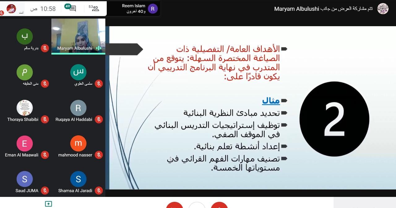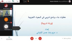 حيث قدمت الدكتورة مريم البلوشية (دكتوراه المناهج وطرق التدريس اللغة العربية) ورشة تديبية بعنوان “خطوات بناء برنامج تدريبي في البحوث التجريبية”، تناولت خلالها الحديث عن مراحل التخطيط لبناء البرنامج التدريبي، بالإضافة إلى خطوات تصميم البرنامج والتي تبدأ بتحديد الهدف العام ثم الأهداف الخاصة، كما وضحت الأسس التي يبنى عليها البرنامج التدريبي ومكونات محتوى البرنامج، مستخدمة نماذج لأنشطة تدريبية من رسالتها في الدكتوراه.