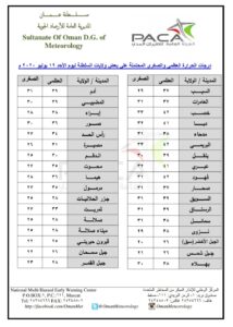 ▪︎ درجات الحرارة : من المتوقع أن تبلغ درجة الحرارة اليوم في مسقط بإذن الله 34 العظمى ، والصغرى 29 – فيما تبلغ في صلالة : العظمى 28 والصغرى 26 ، وتصل درجة الحرارة العظمى اليوم عند بداية الأربعينات في عدد من المواقع بالسلطنة ، في حين تصل أدنى درجات الحرارة (21) في جبل شمس .