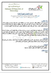 ▪︎ الرباح : تهب على المناطق الساحلية لبحر عمان رياح شمالية شرقية خفيفة إلى معتدلة خلال النهار تتحول إلى متغيرة الاتجاه خفيفة ليلاً ، وتهب على المناطق الساحلية لبحر العرب رياح جنوبية غربية معتدلة إلى نشطة ، فيما تهب على بقية محافظات السلطنة رياح شرقية إلى جنوبية شرقية خفيفة إلى معتدلة تكون نشطة أحيانا .