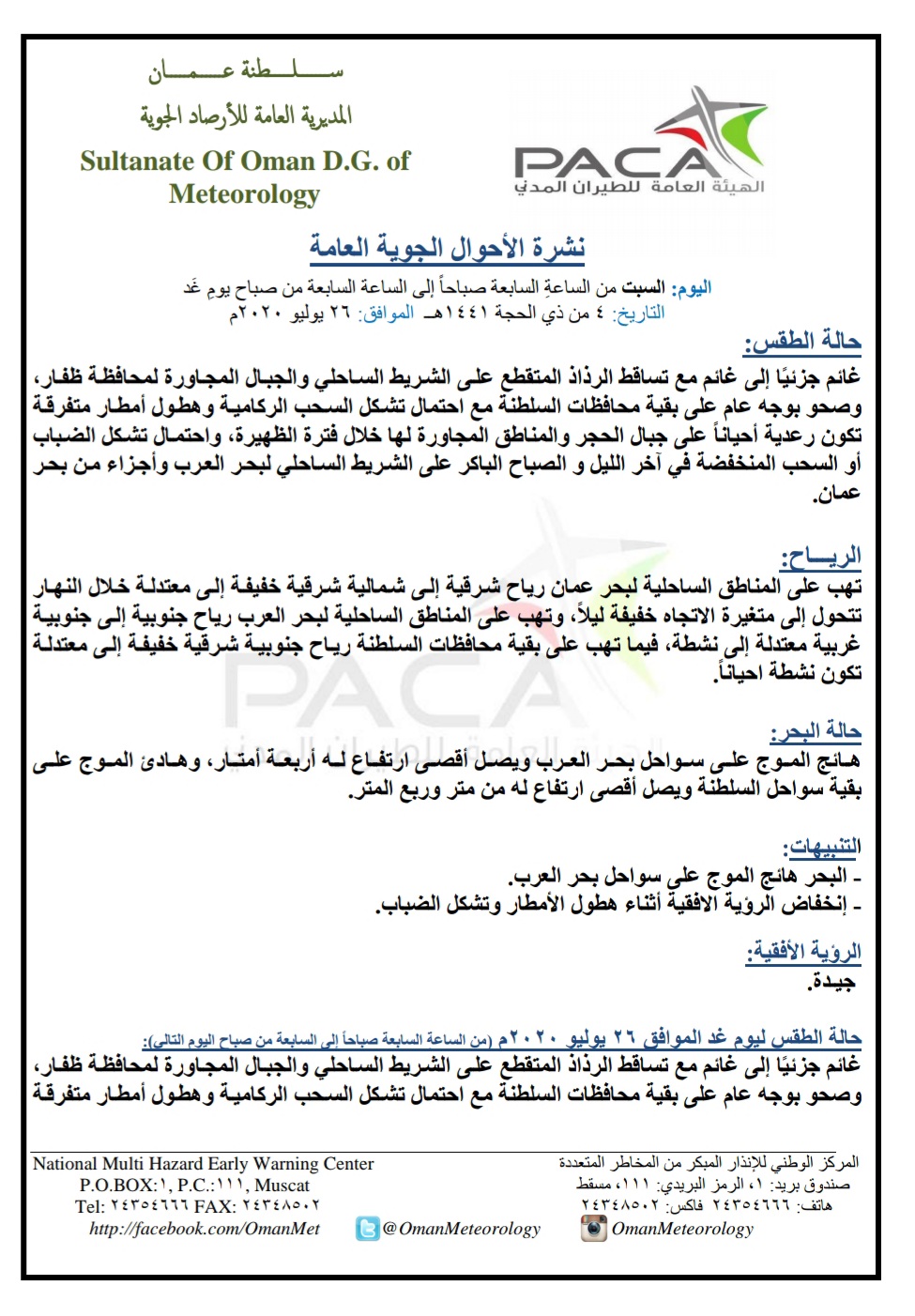 متابعينا الكرام إليكم فيما يلي نشرة الأحوال الجوية في محافظات السلطنة لهذا اليوم : السبت الرابع ذي الحجة 1441هـ الموافق الخامس والعشرين من يوليو 2020م – بإذن الله تعالى .