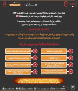 أعلنت وزارة الصحة عن وفاة 9 مصابين بفيروس كورونا كوفيد١٩ ليبلغ العدد التراكمي للوفيات من هذا المرض بالسلطنة (393).