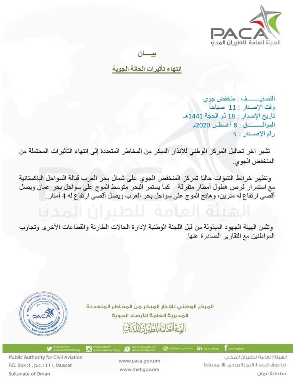 تشير آخر تحاليل المركز الوطني للإنذار المبكر من المخاطر المتعددة إلى انتهاء التأثيرات المحتملة من المنخفض الجوي وتظهر خرائط التنبؤات حالياً تمركز المنخفض الجوي على شمال بحر العرب قبالة السواحل الباكستانية مع استمرار فرص هطول أمطار متفرقة كما يستمر البحر متوسط الموج على سواحل بحر عمان ويصل أقصى ارتفاع له مترين ، وهائج الموج على سواحل بحر العرب ويصل أقصى ارتفاع له 4 أمتار . وتثمن الهيئة الجهود المبذولة من قبل اللجنة الوطنية لإدارة الحالات الطارئة والقطاعات الأخرى وتجاوب المواطنين مع التقارير الصادرة عنها .