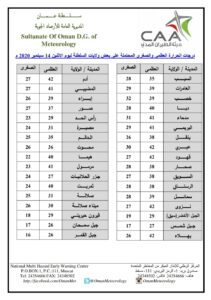 ▪︎ درجات الحرارة : من المتوقع أن تبلغ درجة الحرارة العظمى اليوم في مسقط بإذن الله 35 ، والصغرى 27 – فيما تبلغ في صلالة : العظمى 31 والصغرى 24 ، وتصل درجة الحرارة العظمى اليوم 42 في عدد من المواقع بالسلطنة ، كما تصل أدنى درجات الحرارة (16) في جبل القمر .