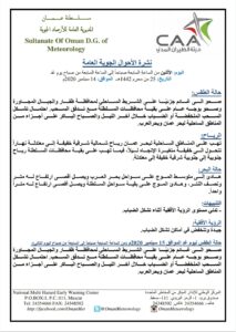 ▪︎ الرياح : تهب على المناطق الساحلية لبحر عمان رياح شمالية شرقية خفيفة إلى معتدلة نهارا تتحول إلى خفيفة متغيِّرة الإتجاه ليلاً ، فيما تهب على بقية محافظات السلطنة رياح جنوبية إلى جنوبية شرقية خفيفة إلى معتدلة .