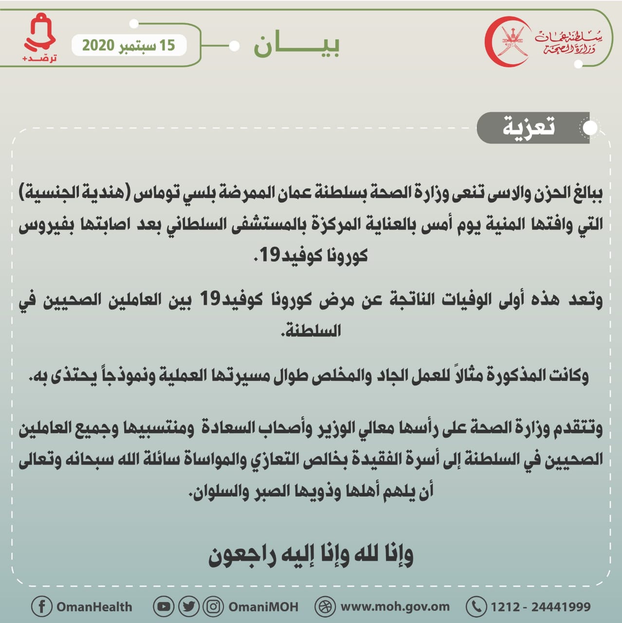 نعت وزارة الصحة الممرضة بلسي توماس (هندية الجنسية) التي وافتها المنية يوم أمس بالعناية المركزة بالمستشفى السلطاني بعد اصابتها بفيروس كورونا كوفيد١٩