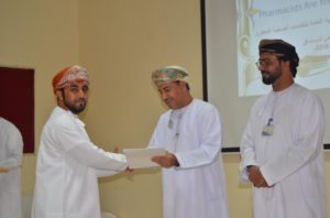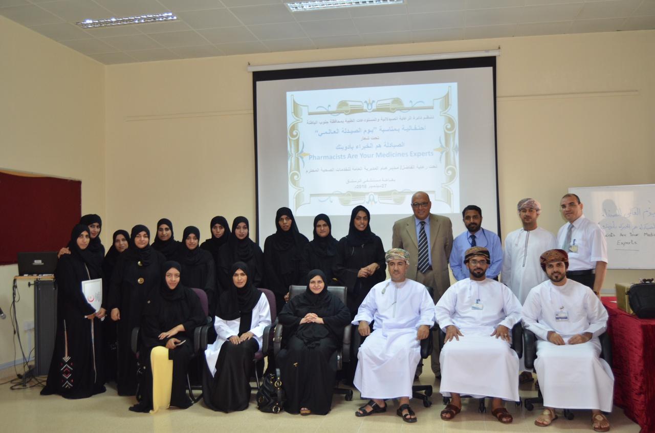 نظمت المديرية العامة للخدمات الصحية بمحافظة جنوب الباطنة فعالية بمناسبة “اليوم العالمي للصيدلة” برعاية الفاضل/ محمد بن خليفة العبري المدير العام للخدمات الصحية بمحافظة جنوب الباطنة في قاعة مستشفى الرستاق، بتاريخ 27 سبتمبر 2018م، بحضور الفاضلة مديرة دائرة الرعاية الصيدلانية في المديرية العام للتموين الطبي بمسقط، وعدد من مدراء الدوائر بالمديرية ، وعدد من الصيادلة ومساعدي الصيادلة بالمحافظة. والقى الفاضل المدير العام كلمة بهذه المناسبة وكذالك قدم الفاضل/ حسن بن خليفة الغافري مدير الرعاية الصيدلانية والمستودعات الطبية بمحافظة جنوب الباطنة عرضا يلخص الدور الهام الذي تقدمه الكوادر الصيدلانية بالمؤسسات الصحية، وقد تم تكريم عدد من الصيادلة ومساعدي الصيادلة المجيدين في هذه المناسبة.