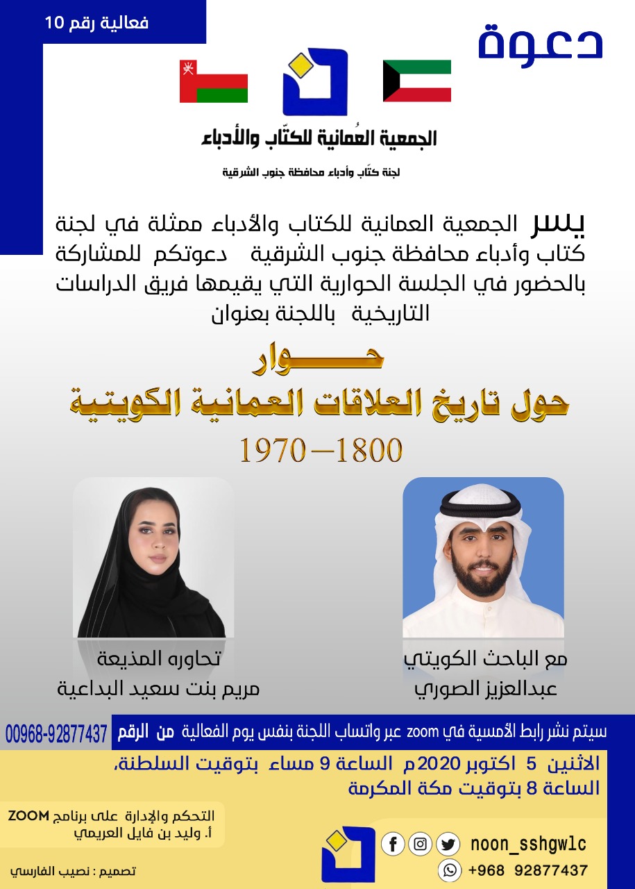 نظمت الجمعية العمانية للكتاب والأدباء ممثلة في لجنة كتاب وأدباء محافظة جنوب الشرقية جلسة حوارية بعنوان تاريخ العلاقات العمانية الكويتية خلال الفترة من (1800 إلى 1970) وذلك عن بعد بواسطة تطبيق (zoom) والتي نفذها فريق الدراسات التاريخية باللجنة مع الباحث الكويتي عبدالعزيز الصوري – حيث أجرت الحوار المذيعة مريم بنت سعيد البداعية ، وقد تم خلال الجلسة طرح ومناقشة العديد من المحاور الهادفة التي تتعلق بالعلاقات التاريخية التي تربط سلطنة عمان بدولة الكويت والتي تمثلت في العلاقات السياسية والاقتصادية والاجتماعية بين البلدين الشقيقين خلال الفترة من ١٨٠٠ م حتى ١٩٧٠م وذلك من حيث بداية هذه العلاقة وكذلك طبيعتها ، كما تم التطرق إلى أهم الفترات التي تخللتها هذه العلاقات وإلى النشاط التجاري بين السلطنة ودولة الكويت ، والتأثير العماني على الاقتصاد الكويتي في تلك الفترة والذي كان يعود سببه إلى استيراد الكويت لأغلب المواد الغذائية والاستهلاكية من سلطنة عمان ، ثم تم التطرق إلى مسألة ظهور النفط في الخليج وخلق فرص الأعمال مما حدى بأبناء عمان للهجرة إلى دولة الكويت للانخراط في مختلف الفرص الوظيفية لأجل كسب الرزق وكان آخر محاور الجلسة هي عودة العمانيين إلى عمان في عام ١٩٧٠م والمشاركة في بناء النهضة المباركة التي قاد زمامها حضرة صاحب الجلالة السلطان قابوس بن سعيد بن تيمور طيَّب الله ثراه .